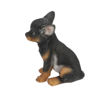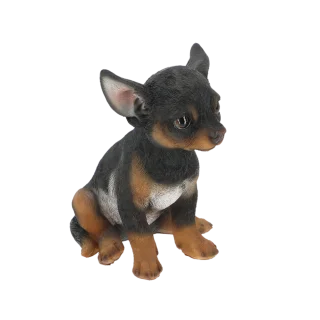 Suloinen, istuva chihuahua-pentu koriste-esine/puutarhapatsas, valmistettu polyresiinista. Sopii sekä sisä- että ulkokäyttöön, kestää pakkasta ja UV-säteilyä.