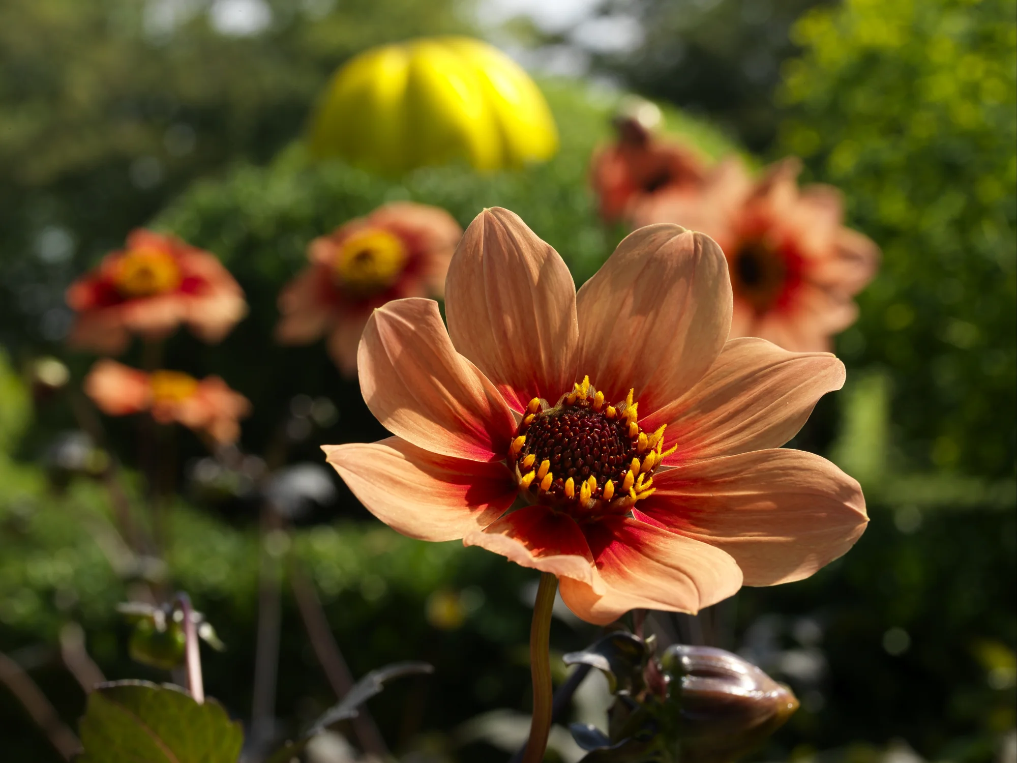 Värikas, yksinkertainen daalia tummalla lehdistöllä jolla aprikoosin, oranssi/punaisen värisellä kukinnolla. Kukinnon leveys 7-12 cm (XS).