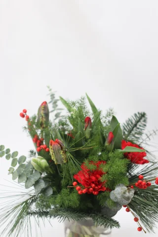 Kuvan tuotteessa on: tulppaani, neilikka, ilex, eucalyptus, parsa, mänty