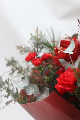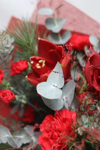 Kuvan tuotteessa on: amaryllis, neilikka, eucalyptus, mänty