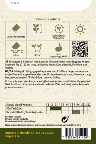 Salaattikurkku. Mehukas ja rapea lajike tuorekäyttöön ja säilöntään. Ristipölyttävä. Saat 17-20 cm pitkiä, tummanvihreitä hedelmiä. Pitkä sadonkorjuuaika. Avomaalle ja kasvihuoneisiin.
