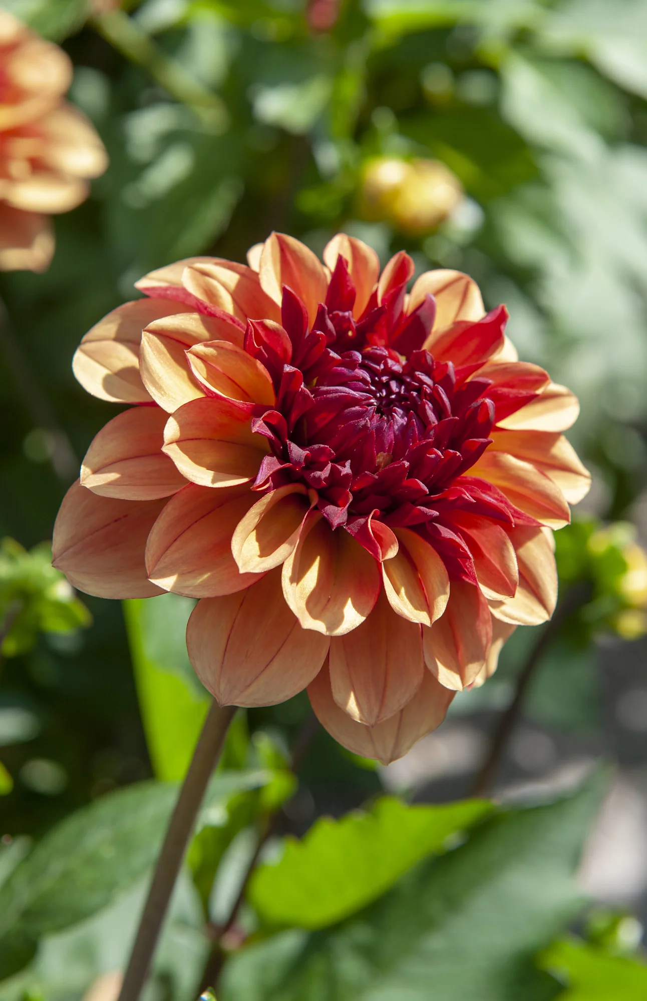 Kauniisti kukkiva koristedaalia jossa viehättävä väritys, terälehtien alapinta kirsikanpinkki ja yläpinta aprikoosinoranssi. Kukinnon leveys 10-15 cm (S)