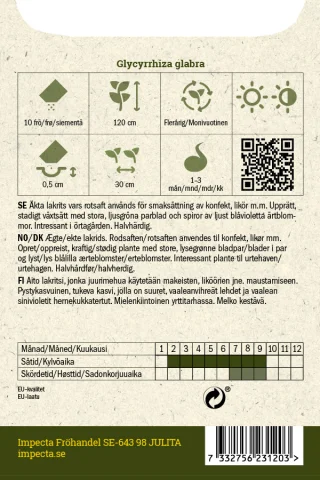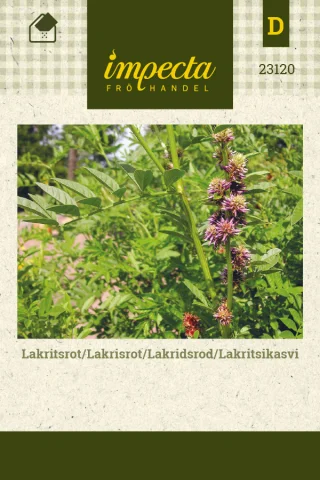 Aito lakritsi, jonka juurimehua käytetään makeisten, liköörien jne. maustamiseen. Pysty, tasainen kasvutapa, vaaleanvihreät parilehdet ja vaaleansinivioletit hernekukkatertut. Kiinnostava yrttitarhassa.