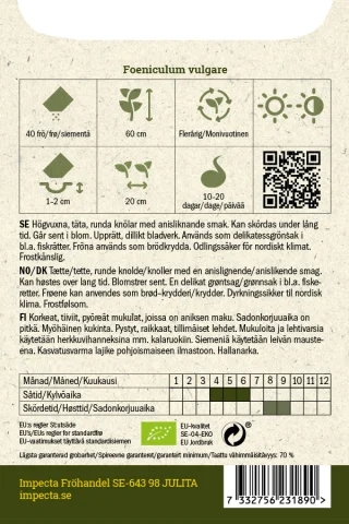 Korkeat, tiiviit, pyöreät mukulat, joissa on aniksen maku. Sadonkorjuuaika on pitkä. Myöhäinen kukinta. Pystyt, raikkaat, tillimäiset lehdet. Mukuloita ja lehtivarsia käytetään herkkuvihanneksina mm. kalaruokiin. Siemeniä käytetään leivän mausteena. Kasvatusvarma lajike pohjoismaiseen ilmastoon.