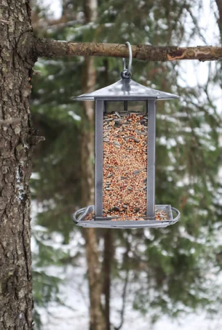 Syöttölaite, jossa nelikulmainen siemensäiliö ja pyöreä katto. Syöttölaite metallia. Syöttölaitteessa on isot ikkunat, joista helppo seurata siementen kulutusta. Korkeus 21 cm ja leveys 16 cm.