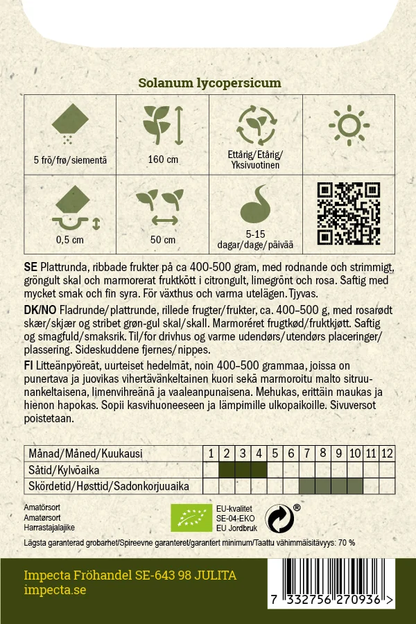 Plattrunda, ribbade frukter på ca 400-500 gram, med rodnande och strimmigt, gröngult skal och marmorerat fruktkött i citrongult, limegrönt och rosa. Saftig med mycket smak och fin syra. För växthus och varma utelägen.