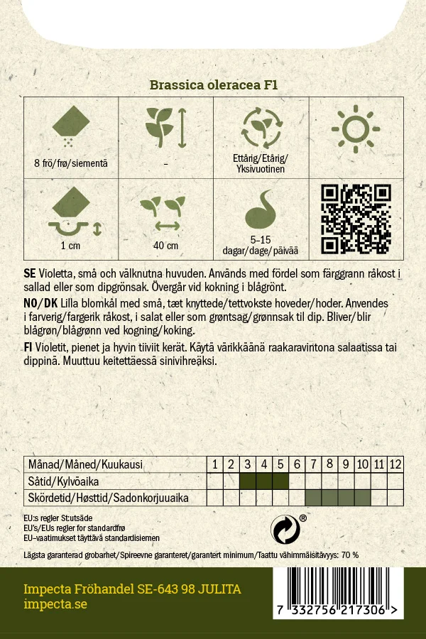 Violetta, små, välknutna huvuden. Används som färggrann råkost i sallad eller som dipgrönsak etc. Övergår i blågrönt vid kokning.