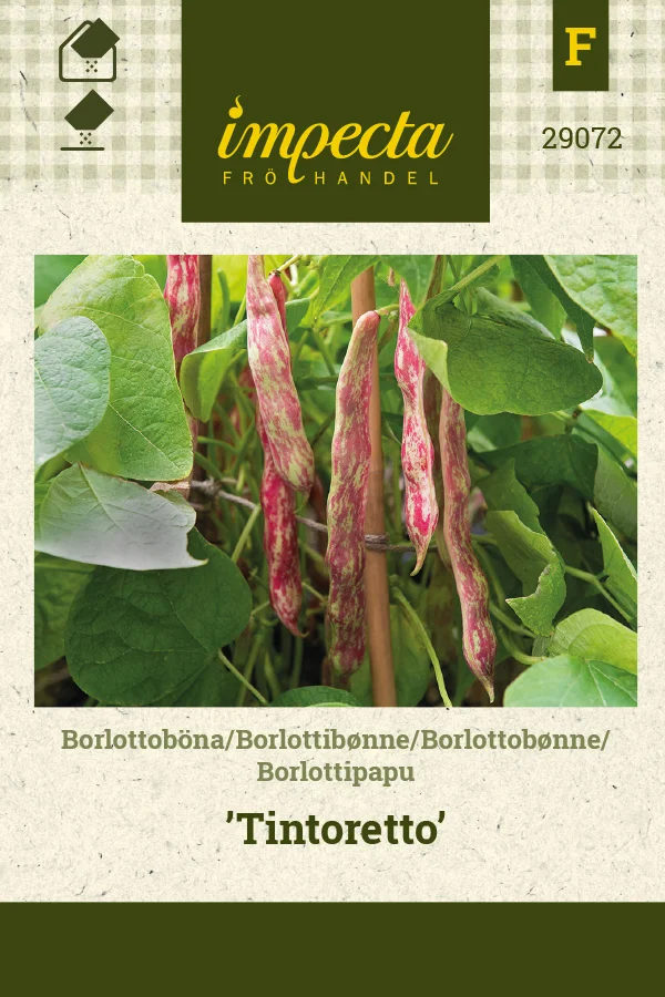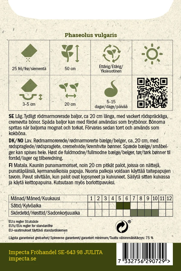 Låg. Vackert rödmarmorerade baljor med rödspräckliga, cremevita bönor. Använd späda baljor som brytbönor eller sprita fullmogna baljor och torka bönorna.