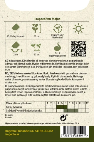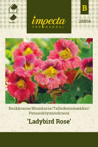 Indiankrasse. Körsbärsröda till antikrosa blommor med svagt purpurfärgade ådringar och klargult svalg. Mycket rikblommande. Halvlånga rankor för amplar, lådor och kanter. Blommor och blad är ätliga och kan användas i sallader, som dekoration m.m.