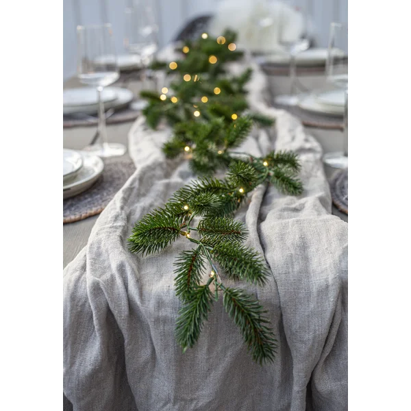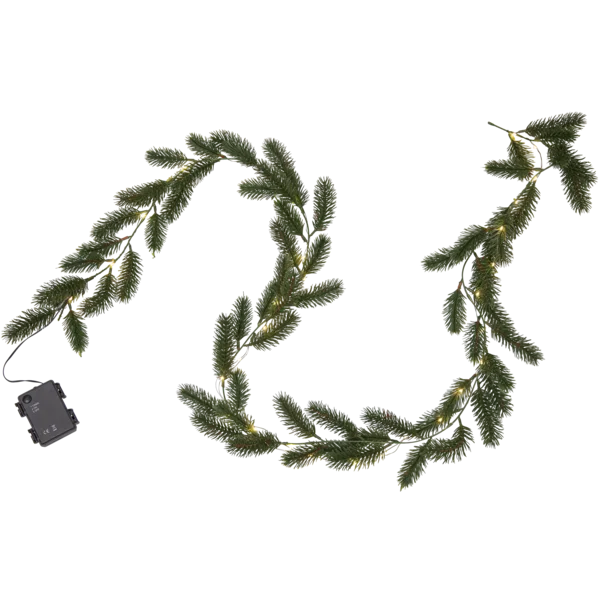 Erna är en vacker girland med mörkgröna naturtrogna barr gjorda i PE-material. Den är 180 cm lång och har 30 st varmvita dew-drop led lampor.