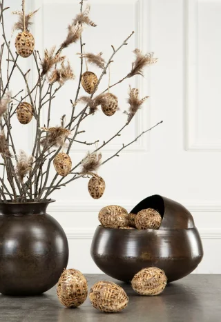 Bruna, randiga fjädrar, ca 10 cm långa. Tråd finns för att fästa i påskriset.