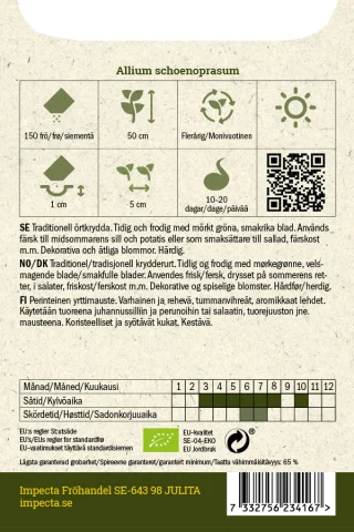 Traditionell örtkrydda. Tidig och frodig med mörkt gröna, smakrika blad. Används färsk till midsommarens sill och potatis eller som smaksättare till sallad, färskost m.m. Dekorativa och ätliga blommor.