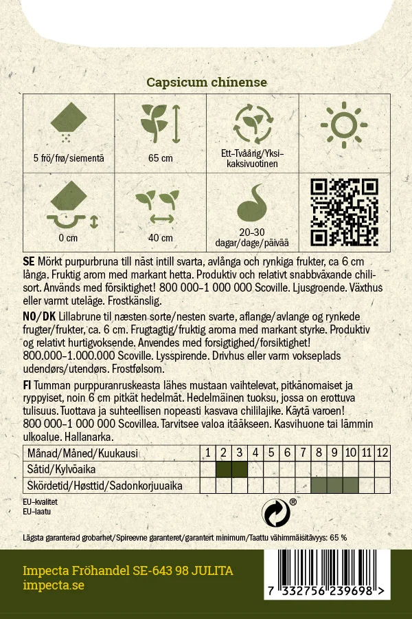 Produktiv, fruktig chilisort med mörkt purpurbruna, rynkiga frukter med markant hetta. Används med försiktighet. 800 000-1 000 000 Scoville.