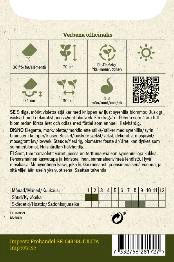 Sirliga, mörkt violetta stjälkar med knippen av ljust syrenlila blommor. Buskigt växtsätt med dekorativt, mossgrönt bladverk. Fin dragväxt. Perenn som står i full blom redan första året och odlas med fördel som annuell.