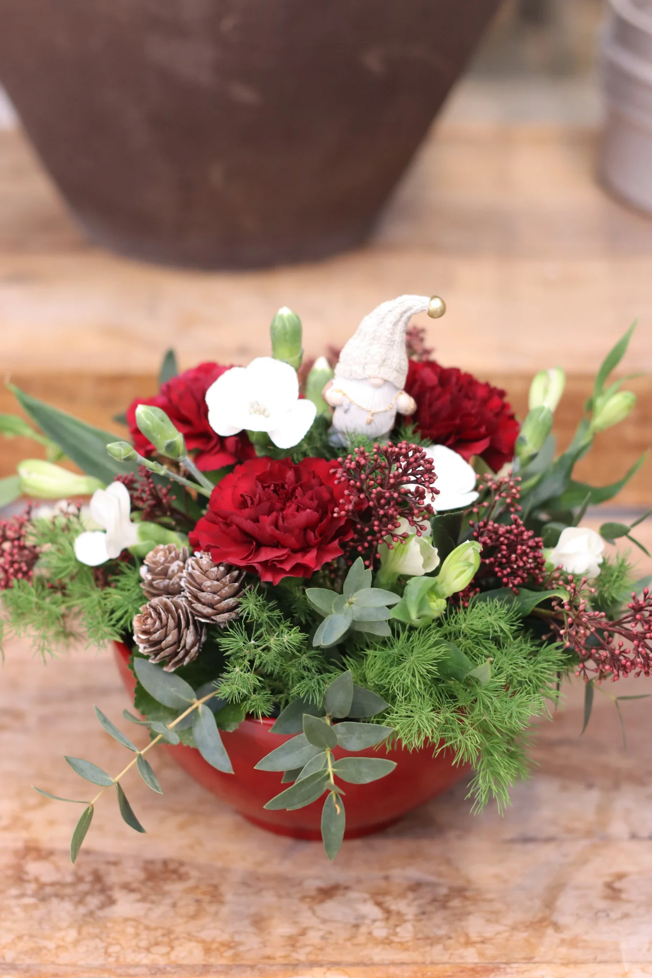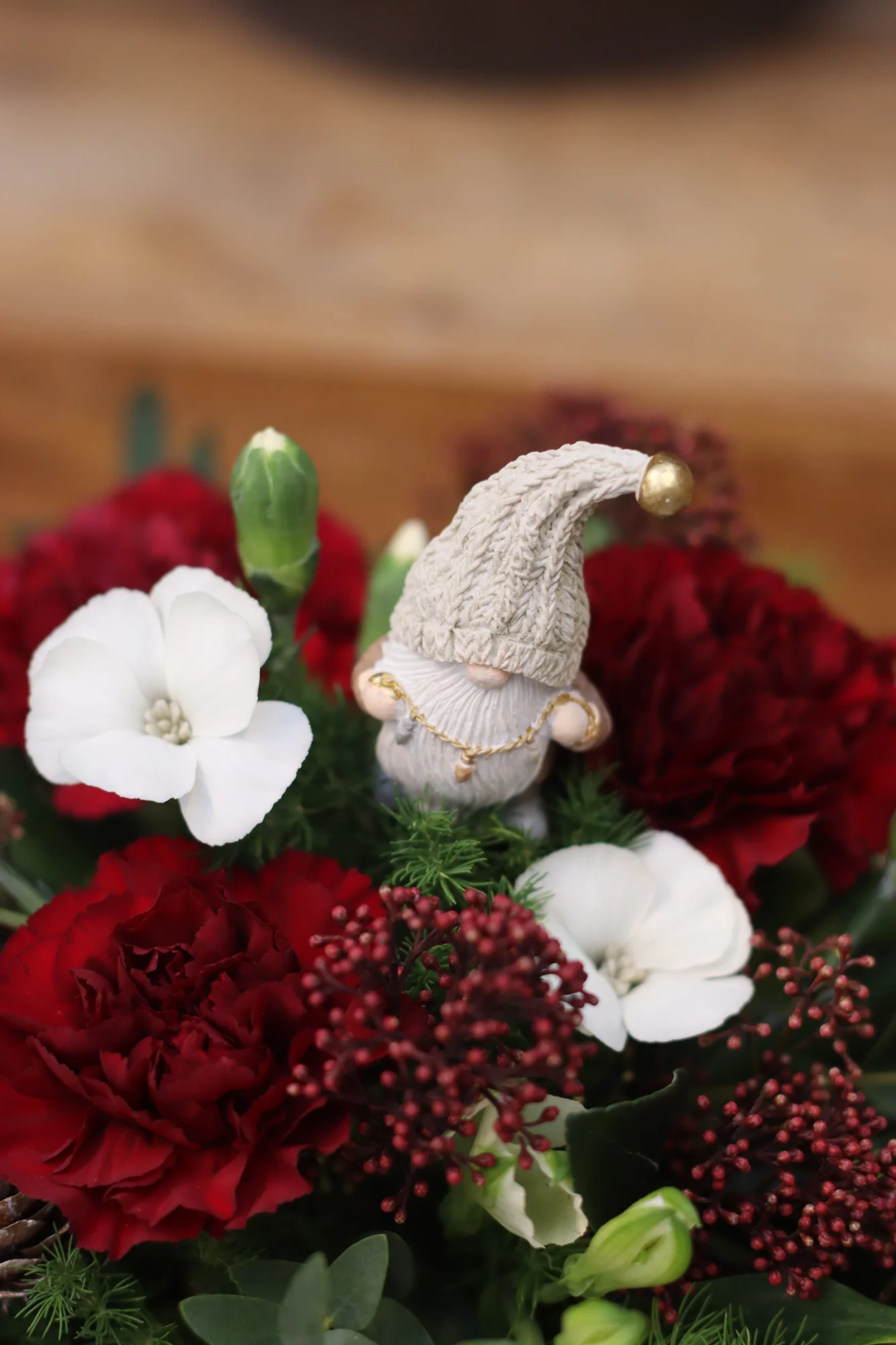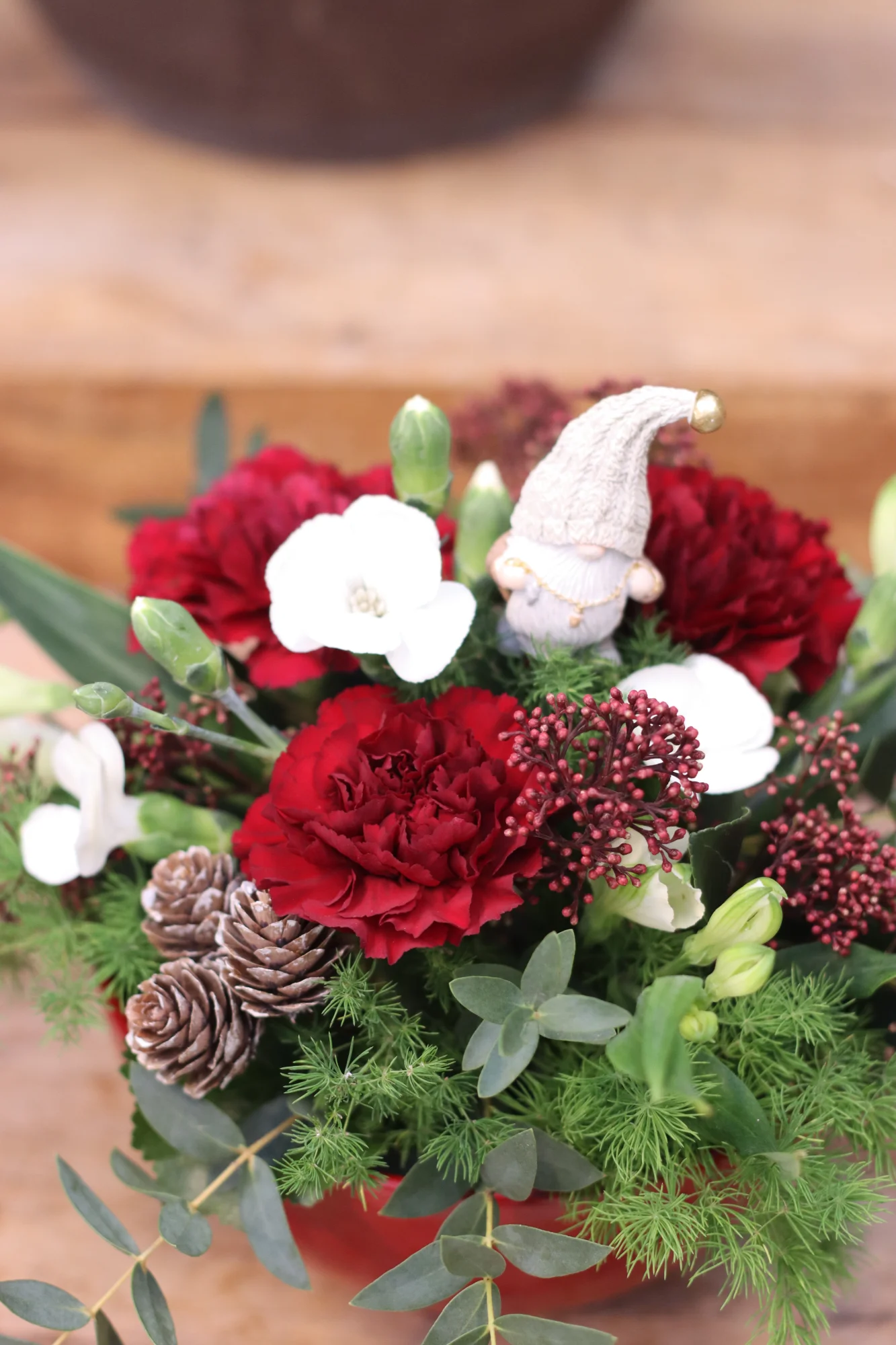 Buketten innehåller: nejlika, kvistnejlika, skimmia, alströmeria, asparagus, prydnadssticka