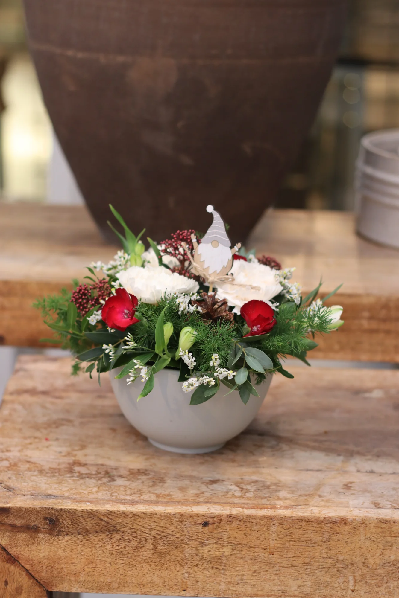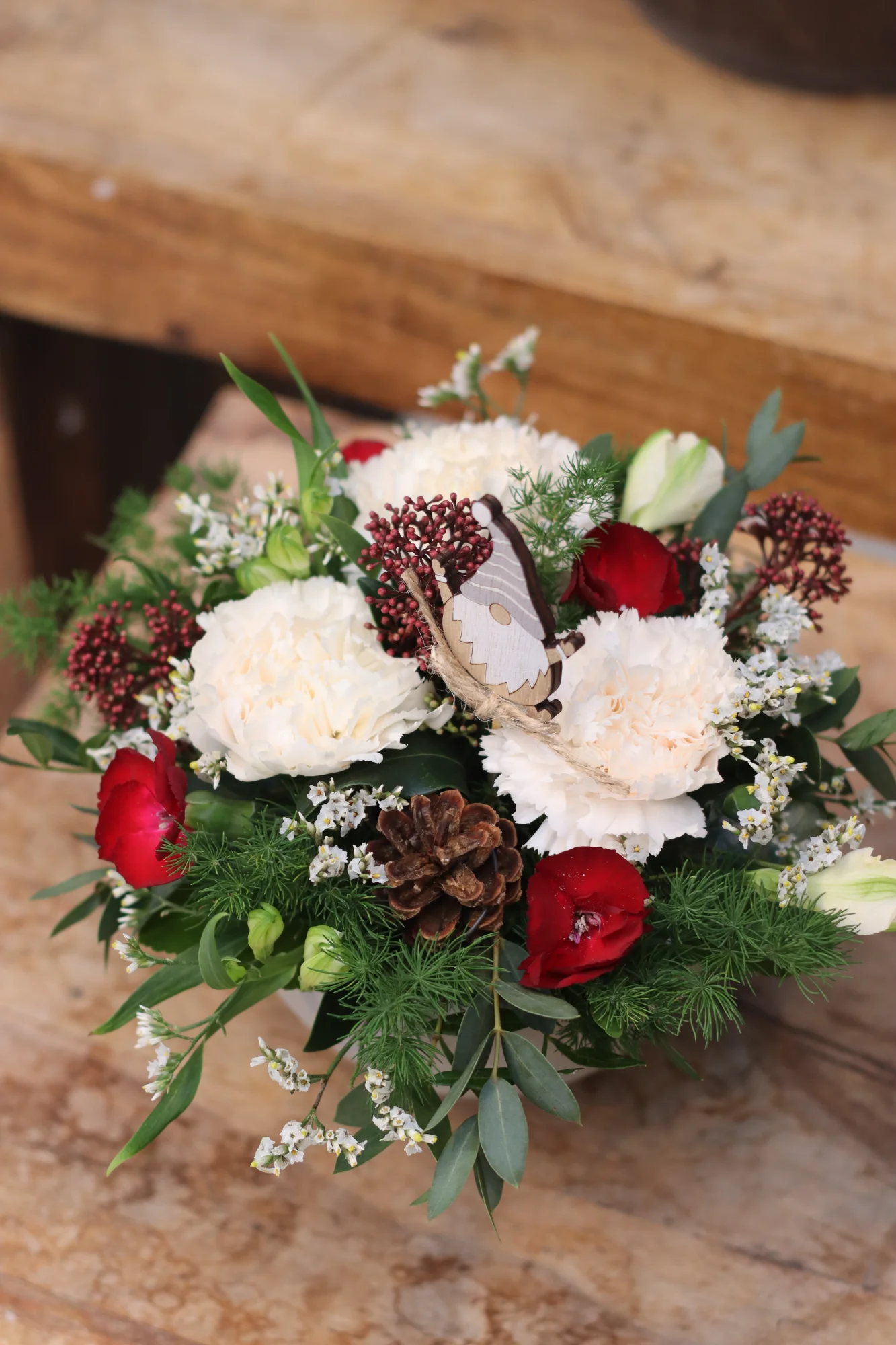 Buketten innehåller: nejlika, kvistnejlika, skimmia, alströmeria, limonium, asparagus, prydnadssticka