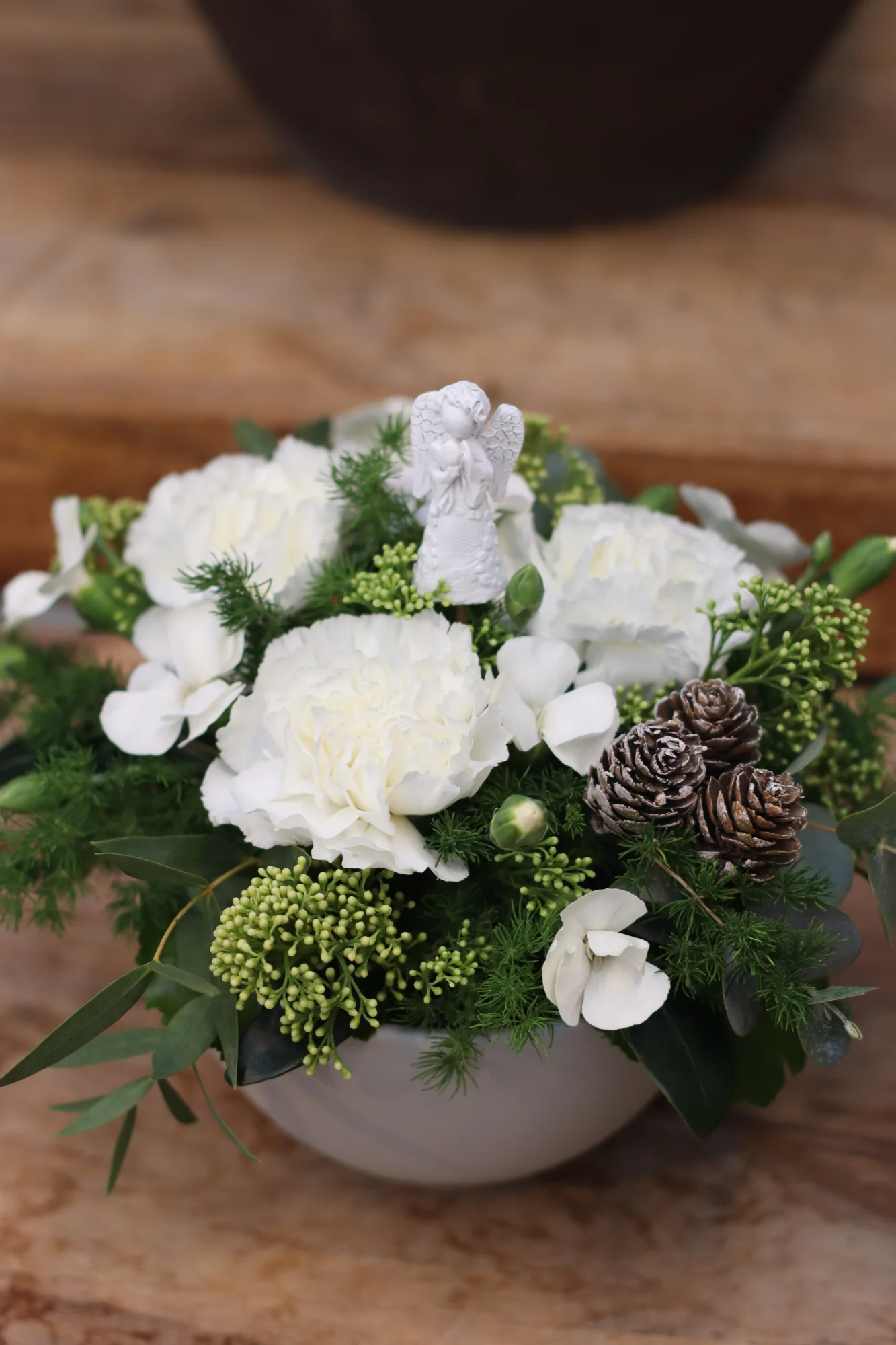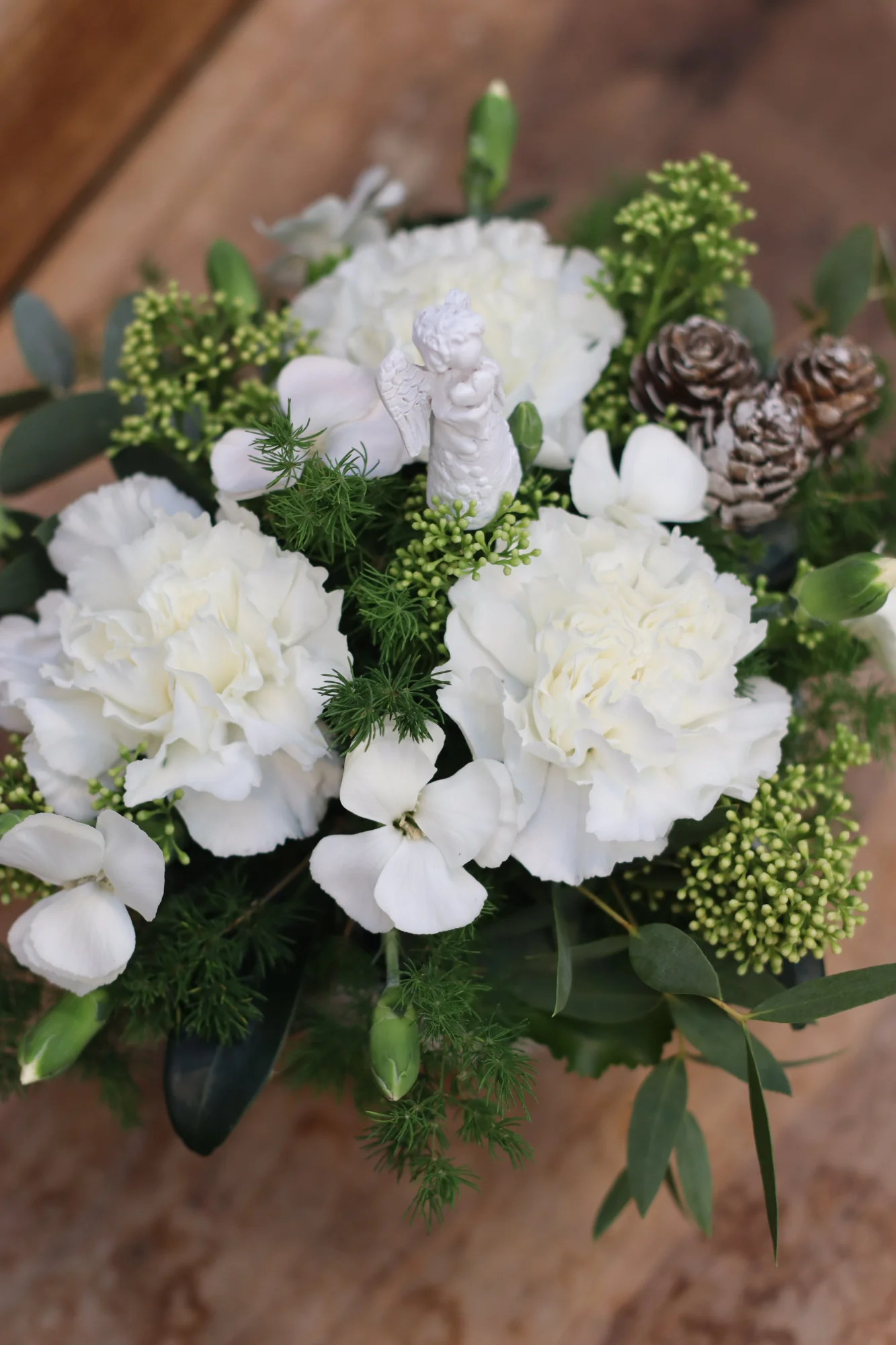 Buketten innehåller: nejlika, kvistnejlika, skimmia, asparagus, prydnadssticka