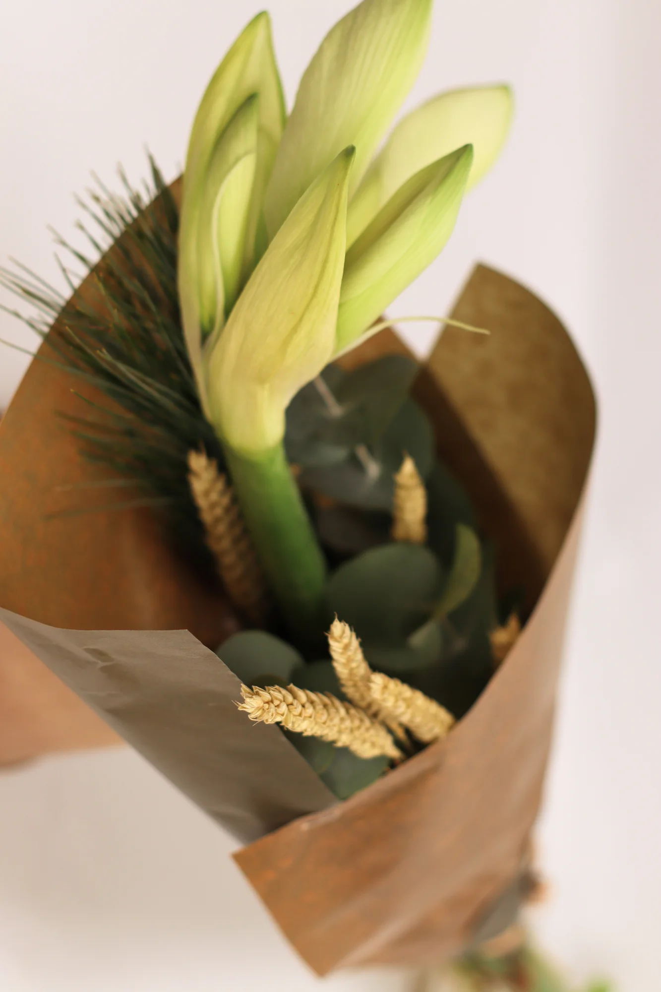 Buketten innehåller: amaryllis, eucalyptus, tall, vete