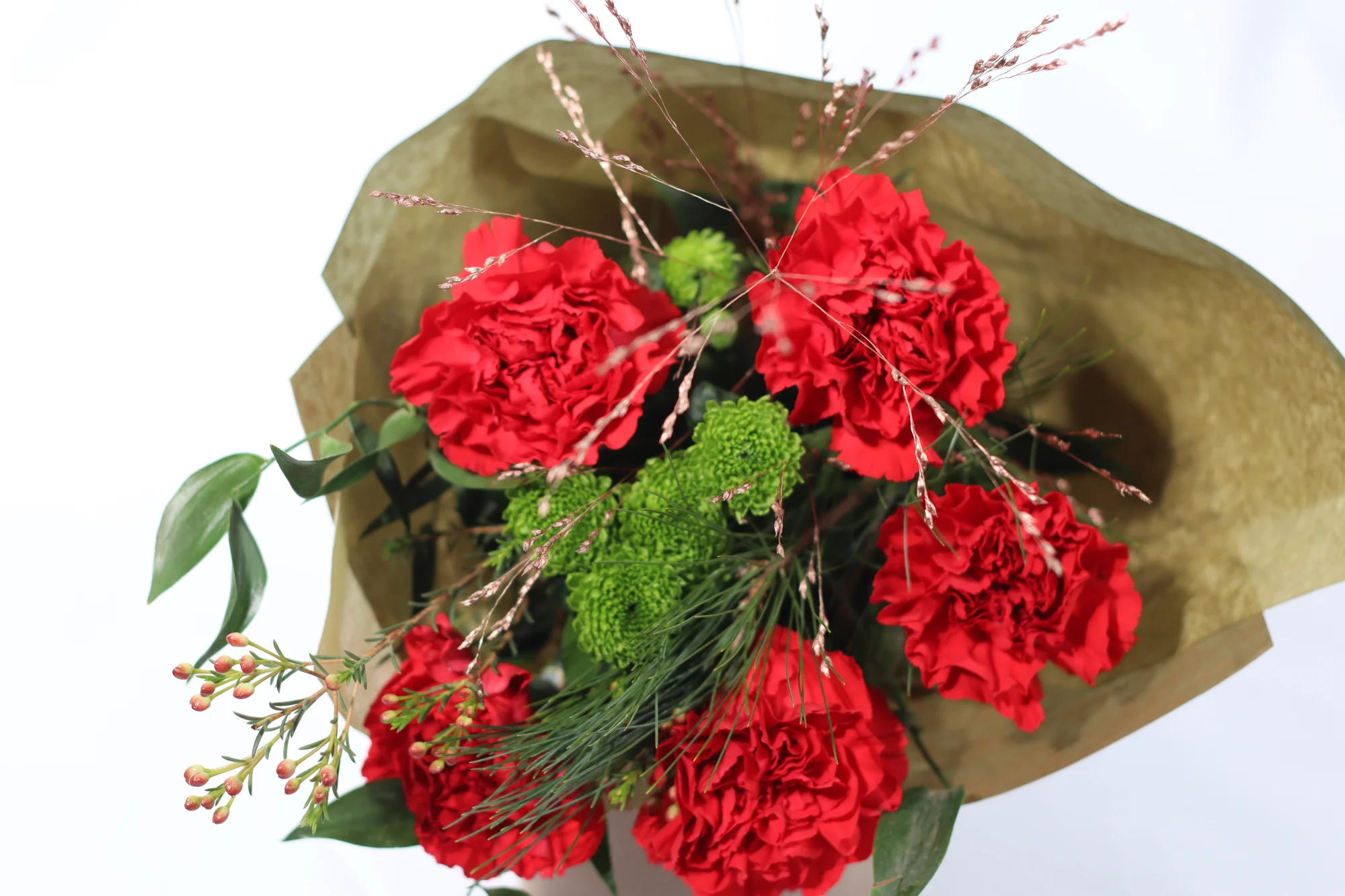 Buketten innehåller: nejlika, krysantem, tall, vaxblomma, färgad hirs
