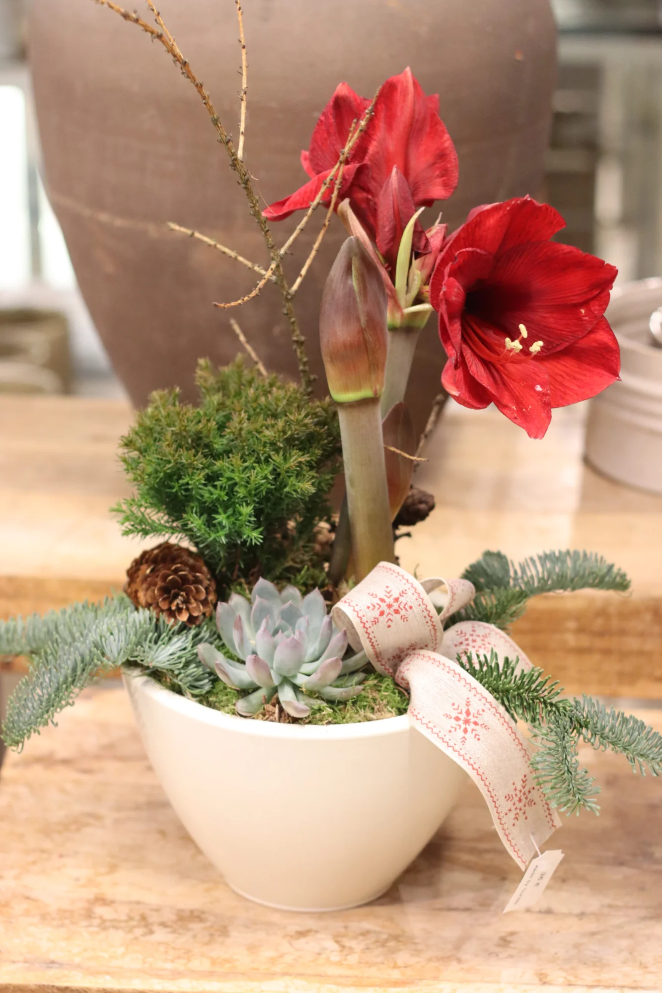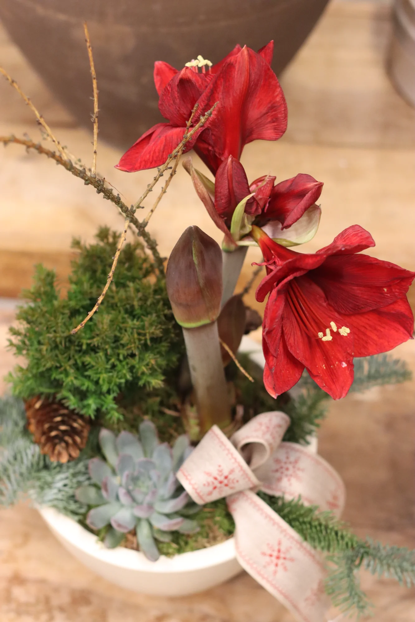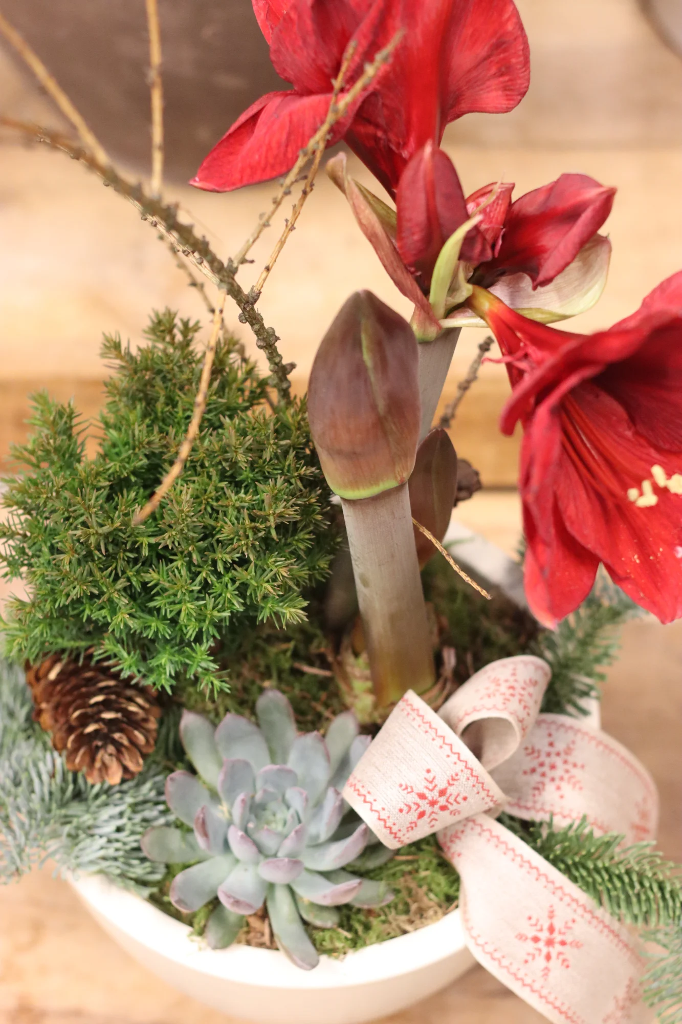 Julkorgen innehåller: amaryllis, echeveria, barrväxt och pynt