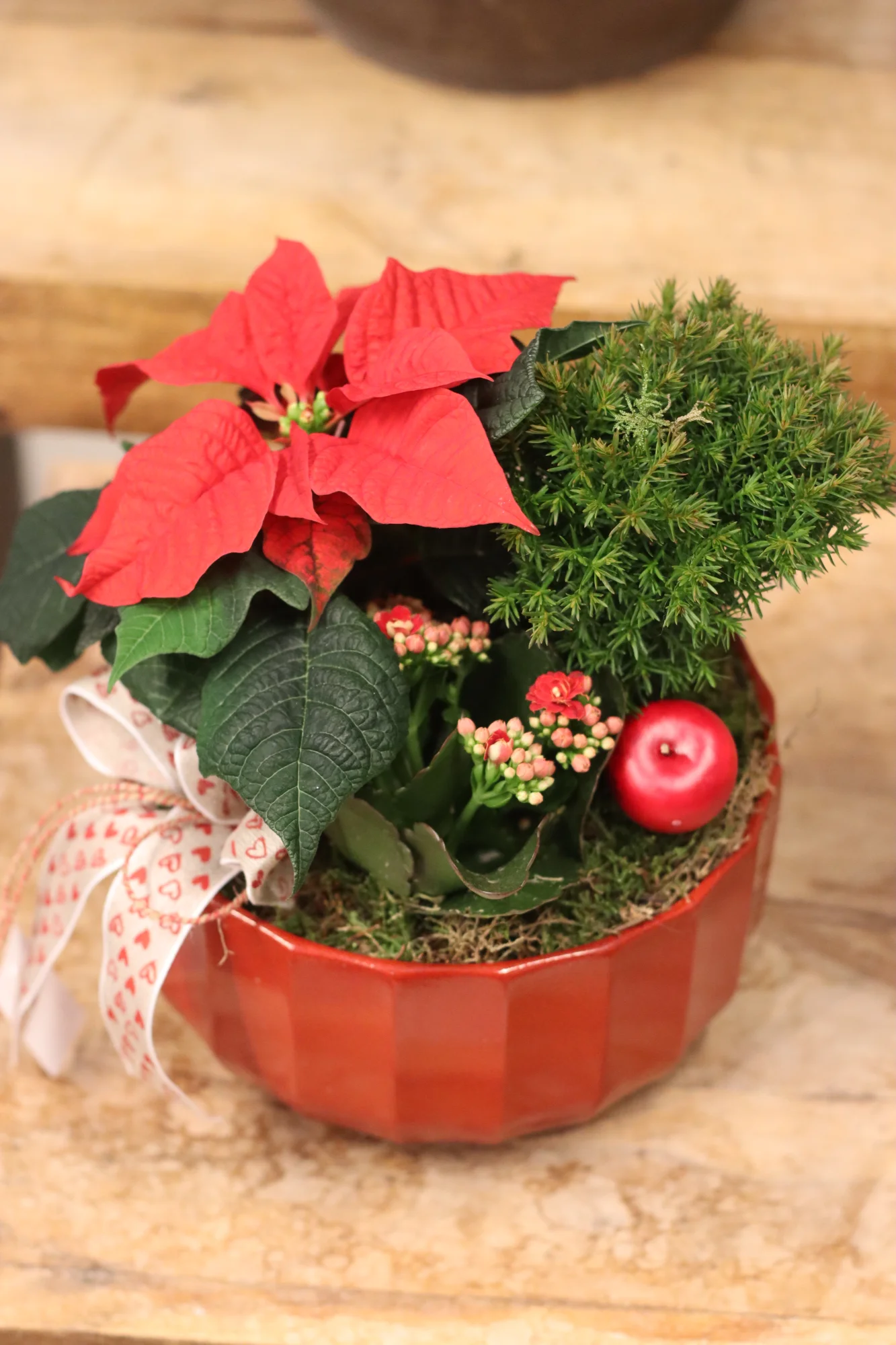 Julkorgen innehåller: julstjärna, höstglöd, barrväxt och pynt