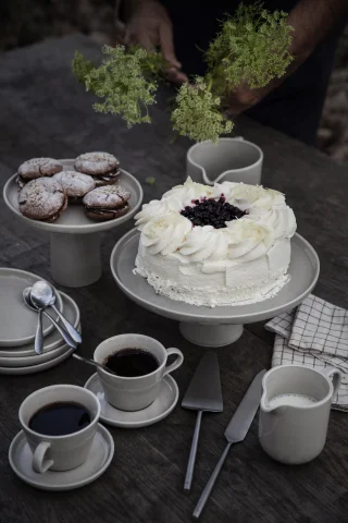 Kopp och fat i en vacker sandgrå färg med inslag av små prickar.