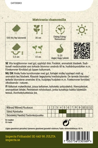 Vita korgblommor med gul, upphöjd disk. Findelat, aromatiskt bladverk. Traditionell medicinalväxt vars torkade blommor används till te, hudvårdsprodukter m.m. Förekommer förvildad på öppen kulturmark.