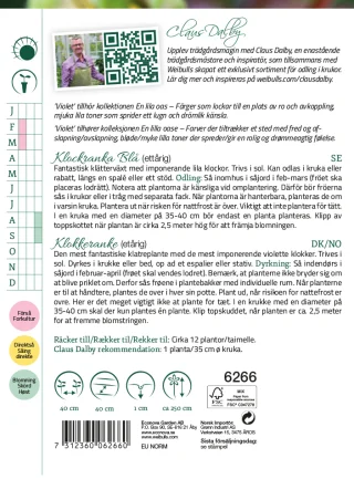 Fantastisk klätterväxt med imponerande lila klockor. Trivs i sol. Kan odlas i kruka eller rabatt, längs en spalé eller ett staket.