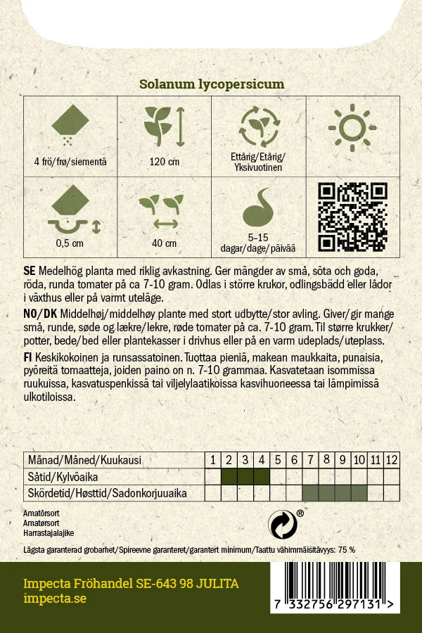 Medelhög, högavkastande planta. Ger mängder av små, söta och goda, röda, runda tomater. Odlas i större krukor, odlingsbädd eller lådor i växthus eller på varmt uteläge.