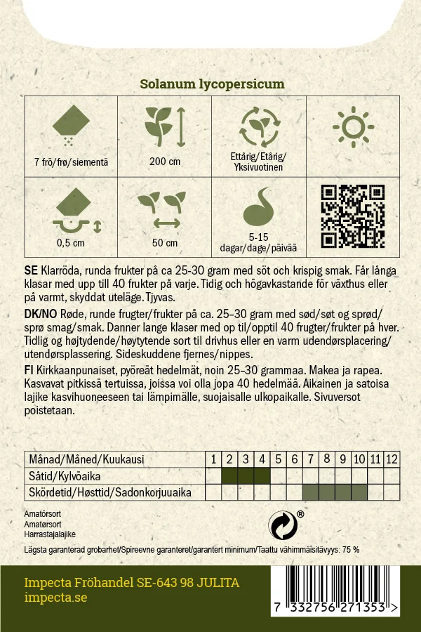 Klarröda, runda frukter på ca 25-30 gram med söt och krispig smak. Får långa klasar med upp till 40 frukter på varje. Tidig och högavkastande för växthus eller på varmt, skyddat uteläge.