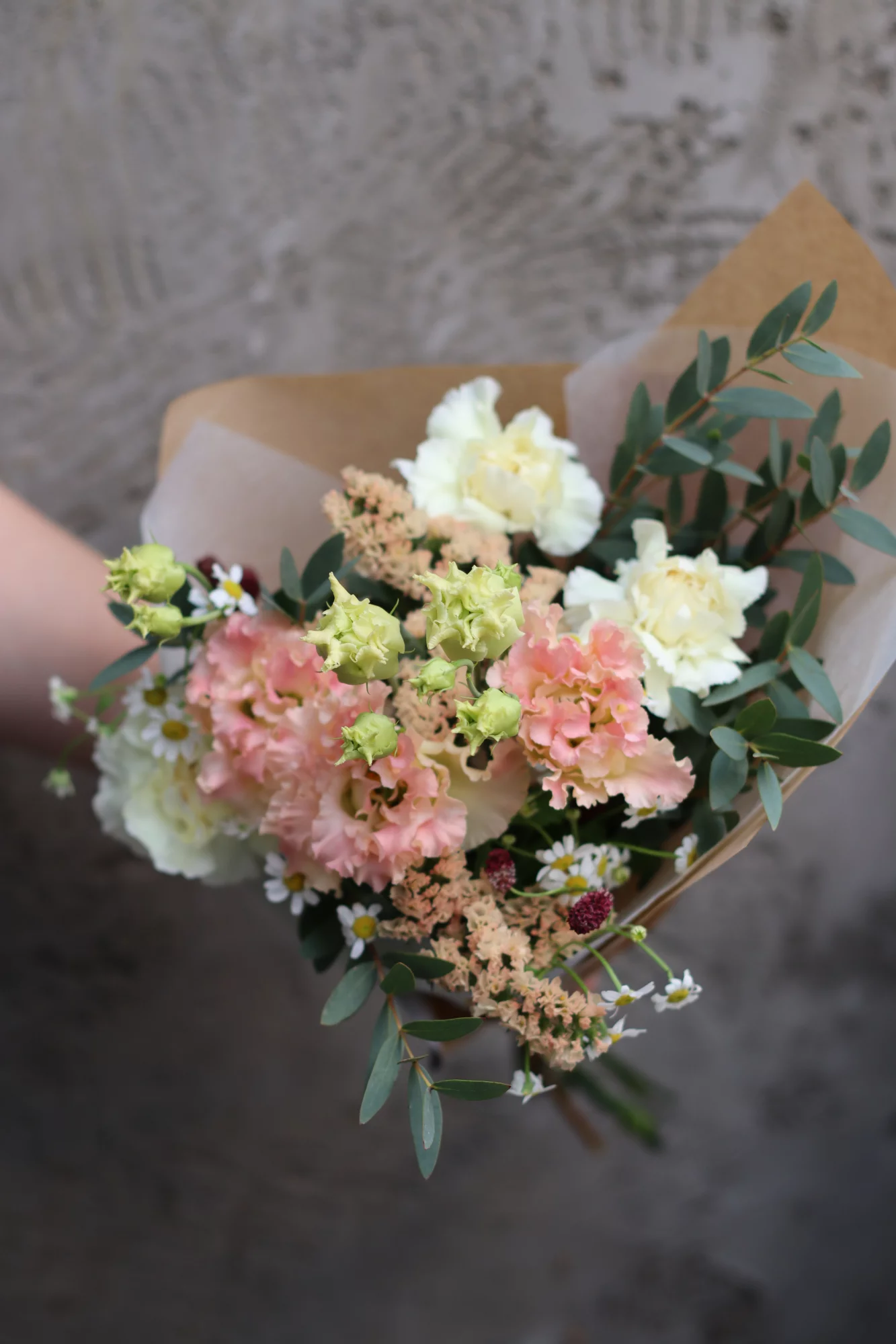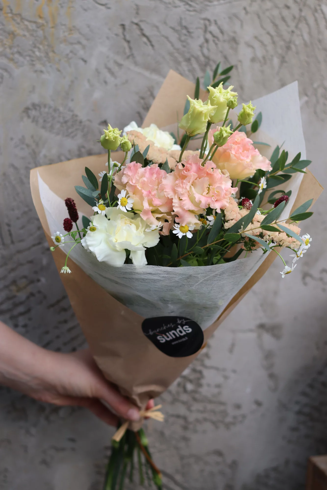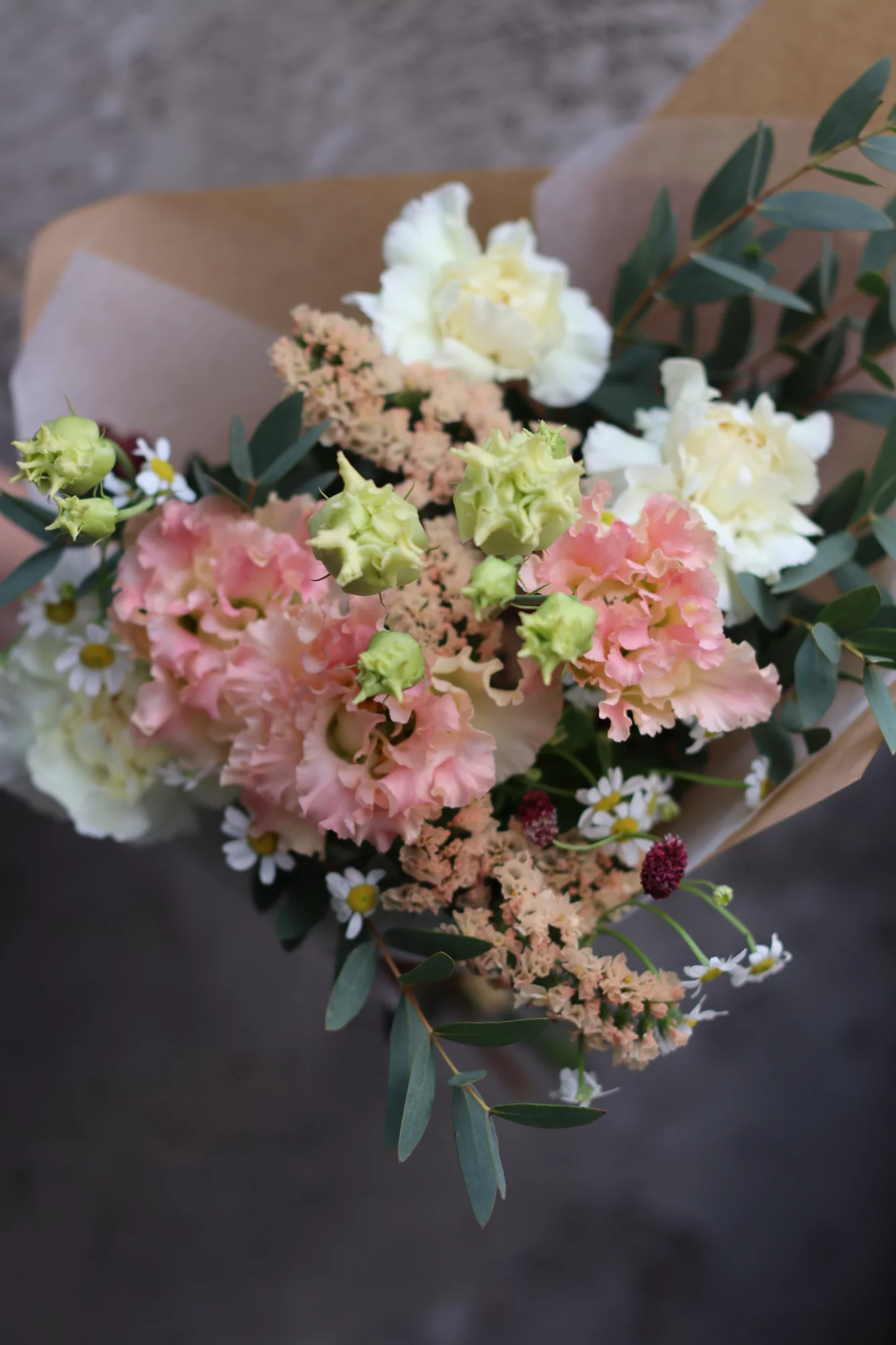 Buketten innehåller: nejlika, statice, prärieklocka, tanacetum, parvifolia
