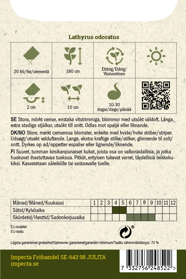#SAKNAS!Stora, mörkt cerise, enstaka vitstrimmiga, blommor med utsökt väldoft. Långa, extra stadiga stjälkar, utsökt till snitt. Odlas mot spaljé eller liknande.