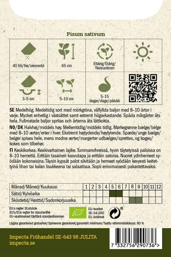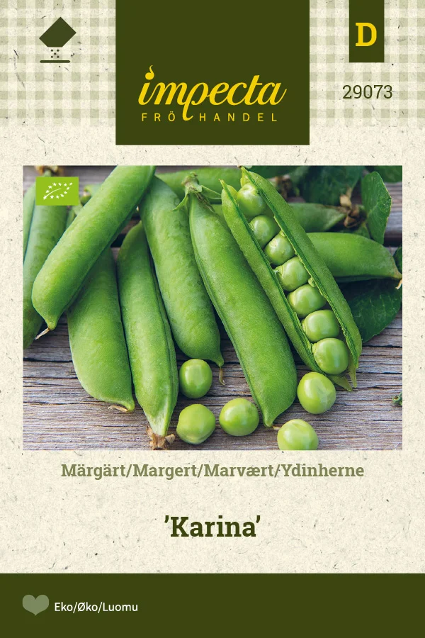 Medelhög. Medeltidig sort med mörkgröna, välfyllda baljor med 8-10 ärtor i varje. Extremt högavkastande. Späda märgärter äts hela medan fullmatade baljor spritas.