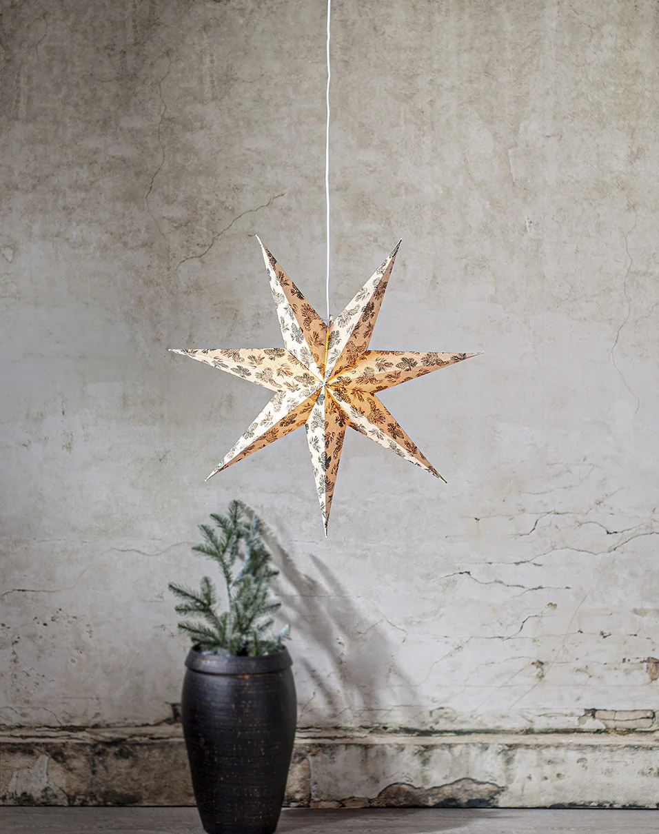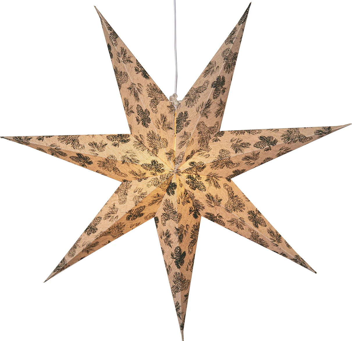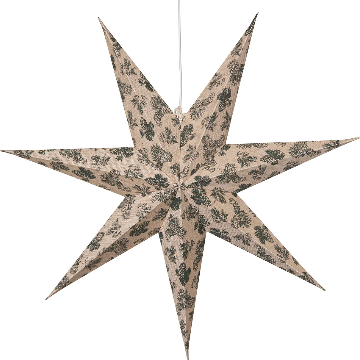 Pappersstjärna med kottar och barr i en vacker beige och grön färg.