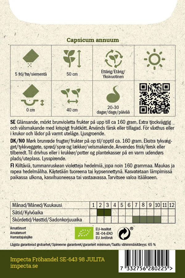 Välsmakande brunvioletta frukter med krispigt fruktkött som används färska eller tillagada. Odla i växthus eller krukor och lådor på varmt uteläge.