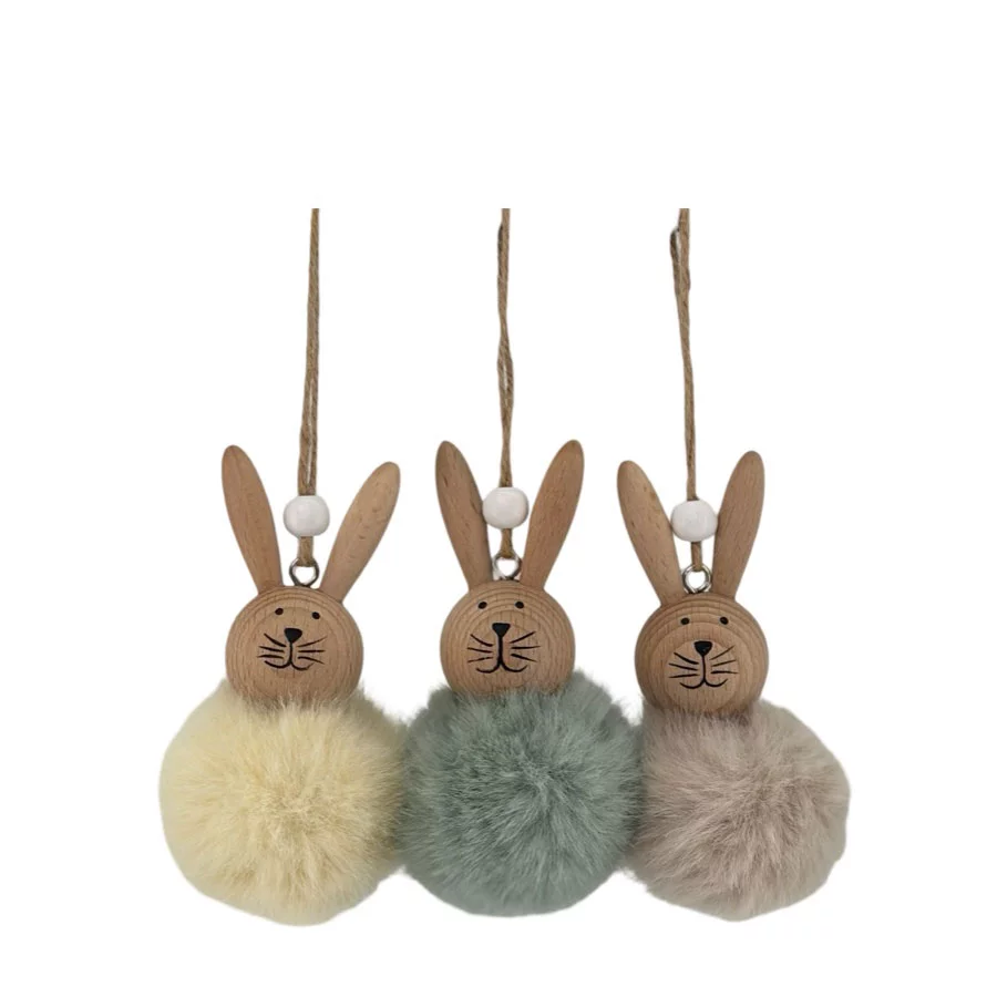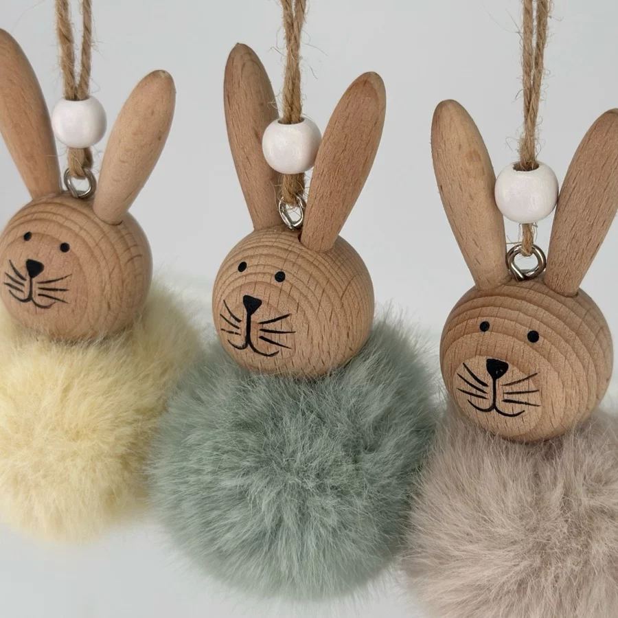 Påskharar med hänge i olika färger.