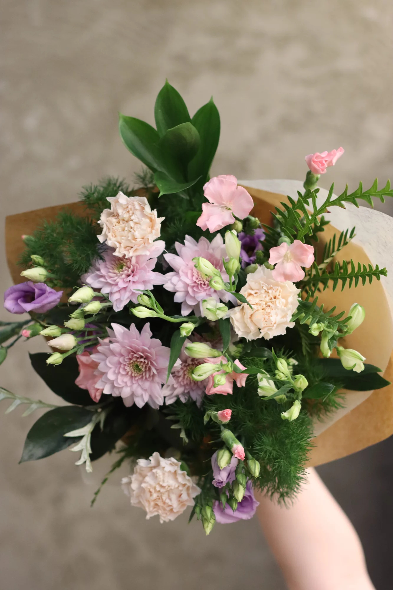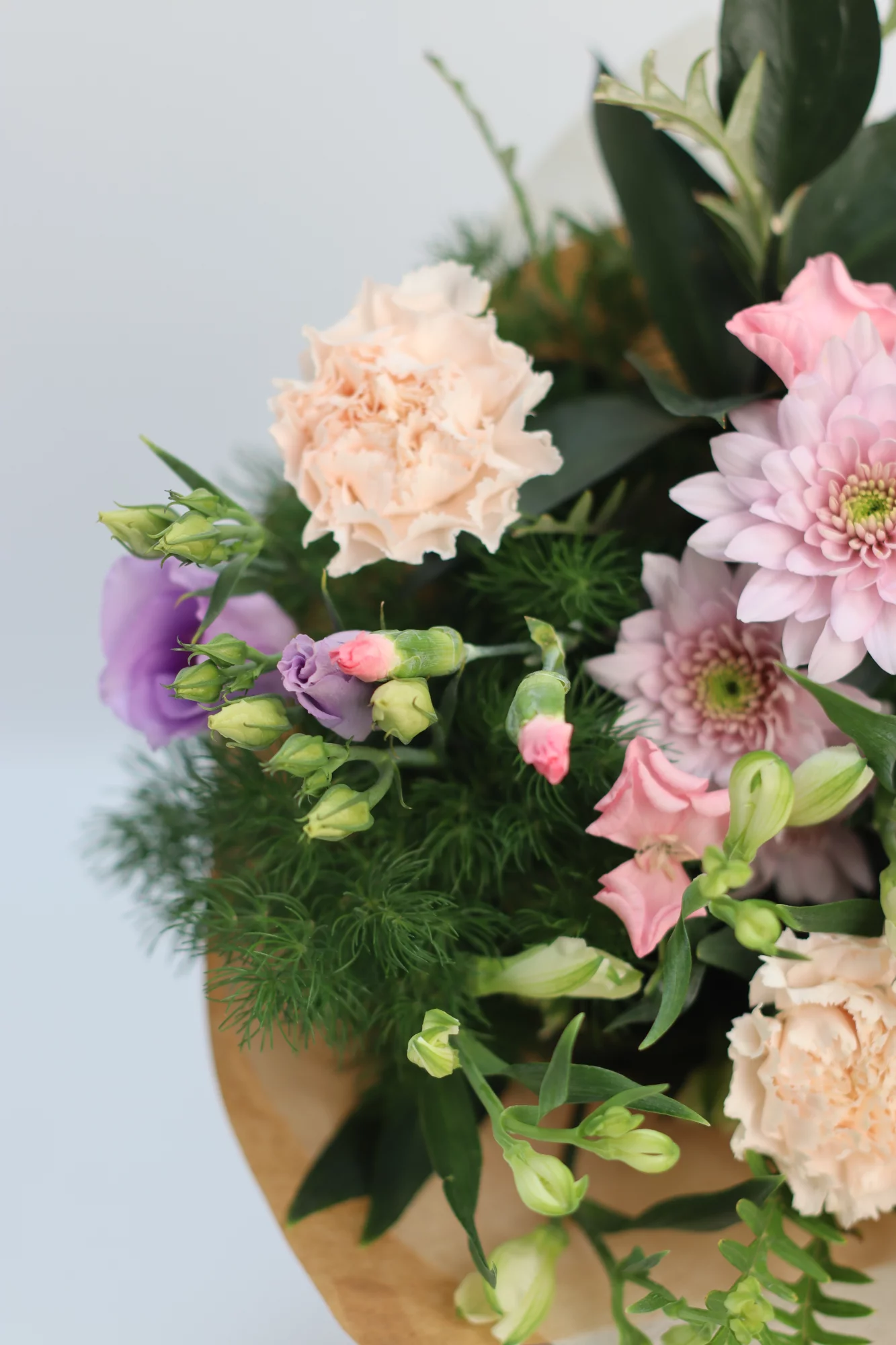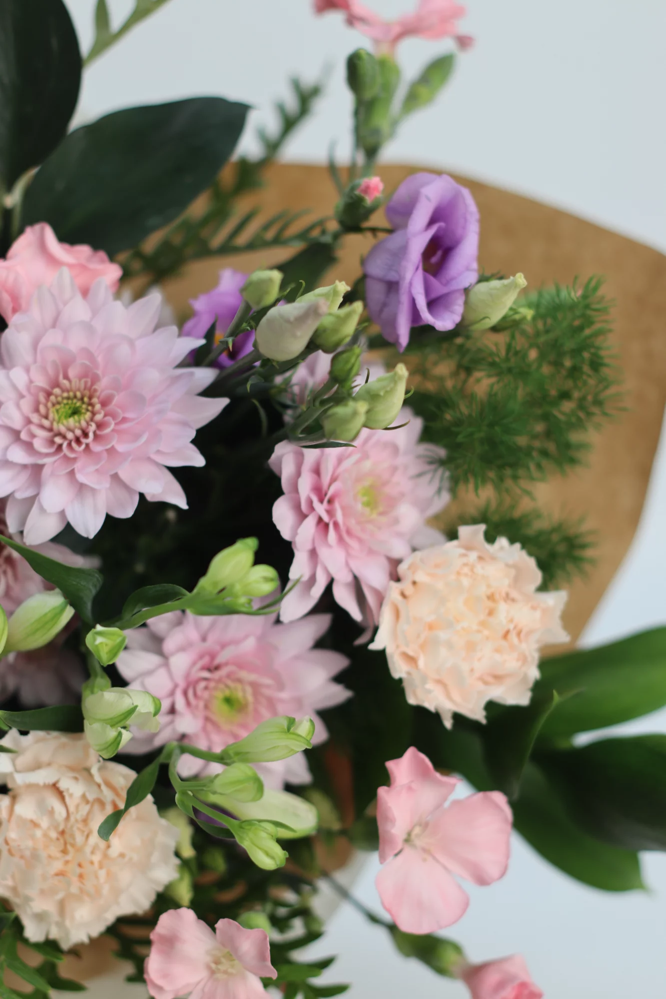 Buketten innehåller: krysantem, nejlika, elegansnejlika, prärieklocka, alströmeria, ruskus