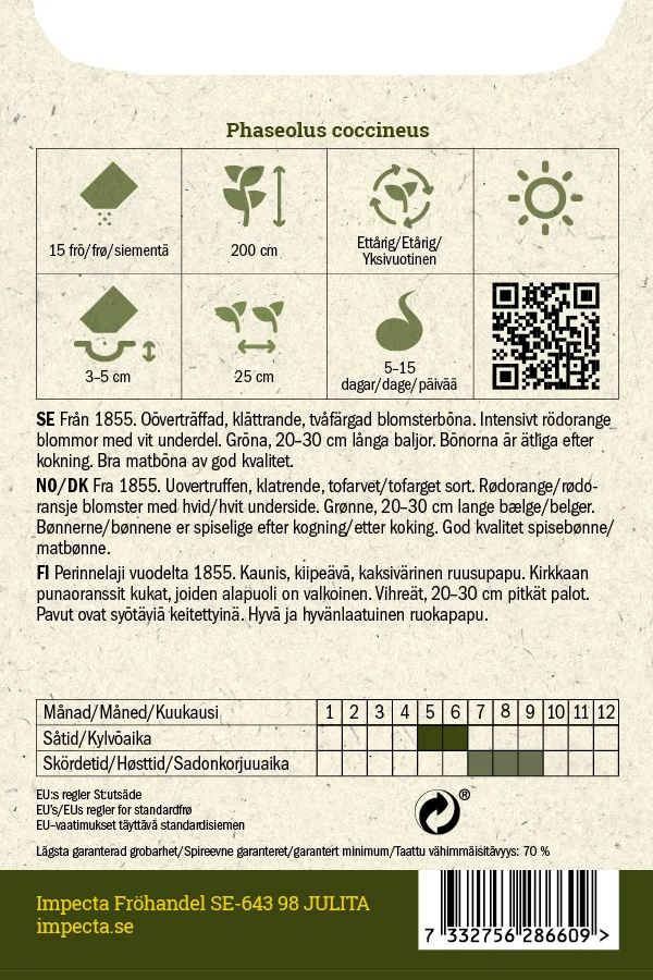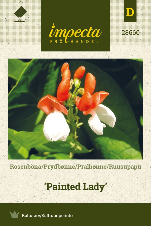Från 1855. Unik, klättrande, tvåfärgad blomsterböna. Läckert rödorange blommor med vit underdel. Gröna, 20-30 cm långa baljor. Bönorna är ätliga efter kokning.
