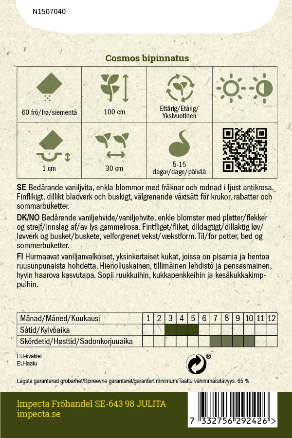 Bedårande vaniljvita, enkla blommor med fräknar och rodnad i ljust antikrosa. Finflikigt, dillikt bladverk och buskigt, välgrenande växtsätt för krukor, rabatter och sommarbuketter.