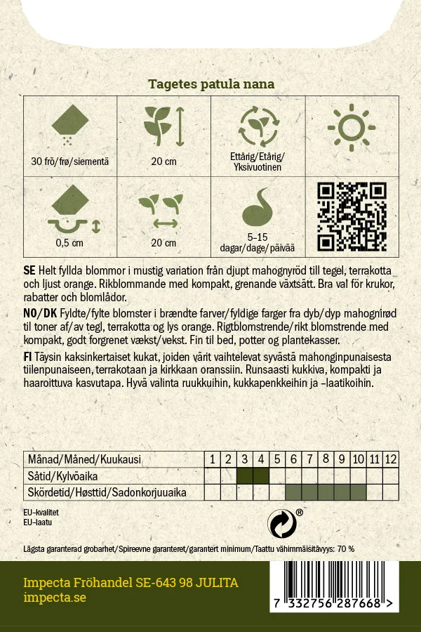 Helt fyllda blommor i mustig variation från djupt mahognyröd till tegel, terrakotta och ljust orange. Rikblommande och kompakt för krukor, rabatter och blomlådor.