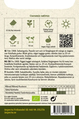Från 1968. Salladsgurka. Populär sort som är föregångare till många av dagens mer förädlade gurkor. Mörkt gröna, något taggiga gurkor, skördas bäst ca 20 cm långa. Korspollinerande. Snabbväxande och högavkastande med hög sjukdomsresistens.