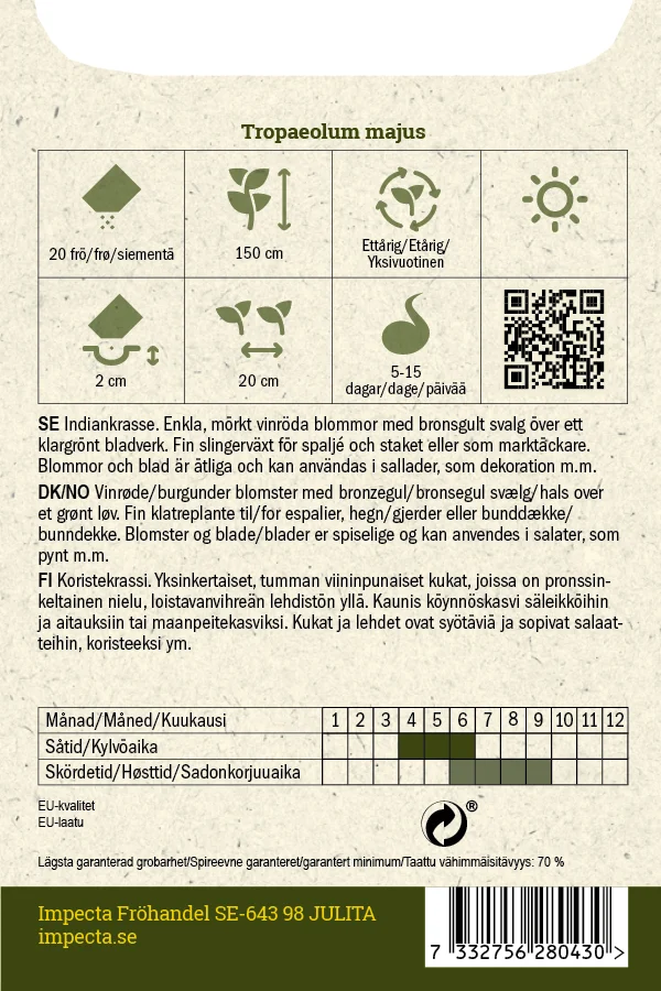 Indiankrasse. Enkla, mörkt vinröda blommor med bronsgult svalg över ett klargrönt bladverk. Fin slingerväxt för spaljé och staket eller som marktäckare. Blommor och blad är ätliga och kan användas i sallader, som dekoration m.m.