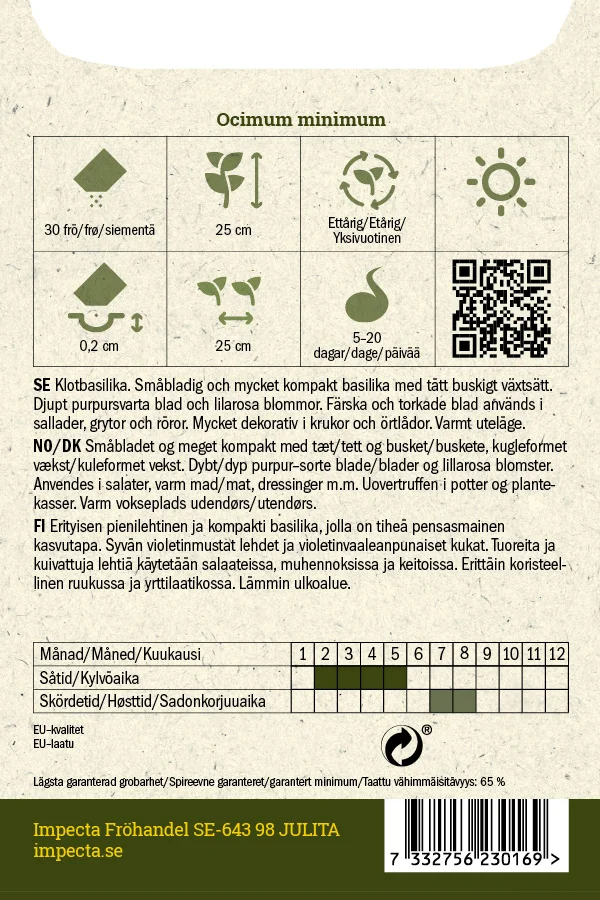 Småbladig, kompakt klotbasilika med purpursvarta blad och tätt, buskigt växtsätt. Mycket dekorativ i krukor och örtlådor. Bladen äts färska eller torkade.