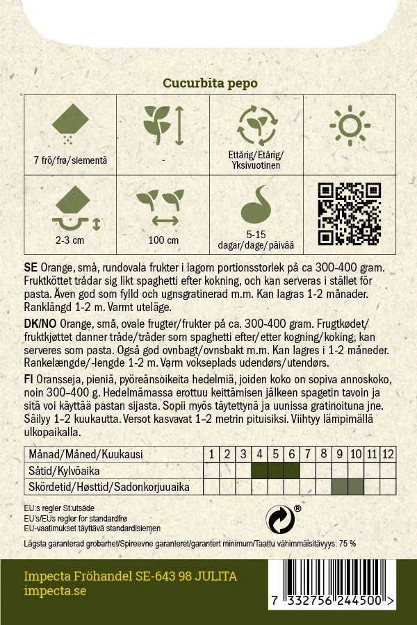 Orange, små, rundovala frukter i lagom portionsstorlek på ca 300-400 gram. Fruktköttet trådar sig likt spaghetti efter kokning, och kan serveras i stället för pasta. Även god som fylld och ugnsgratinerad m.m. Kan lagras 1-2 månader. Ranklängd 1-2 meter.