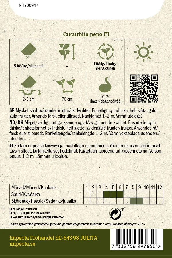 Snabbväxande sort med cylindriska, helt släta, guldgula frukter. Används färsk eller tillagad. Ranklängd 1-2 m.