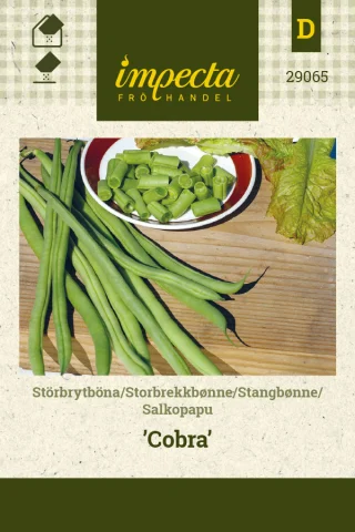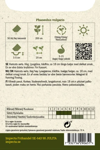 Haricots verts. Hög. Ljusgröna, trådfria, ca 18 cm långa baljor med delikat smak. En av våra bästa brytbönor. Fin fryssort.