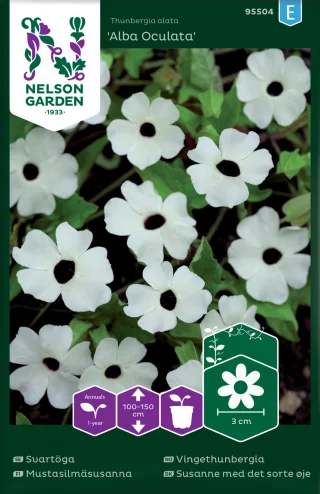 Dennar sort av svartöga har rikligt med vackert vita blommor med svart öga. Växtsättet är slingrande och behöver stöd mot spaljé. Den odlas hos oss som ettårig, men är egentligen en flerårig växt och förutom att användas som sommarblomma utomhus, på t.ex. balkong och uterum, kan den användas som krukväxt i ett söderfönster. Trivs i näringsrik, välgödslad jord. Vattna rikligt.